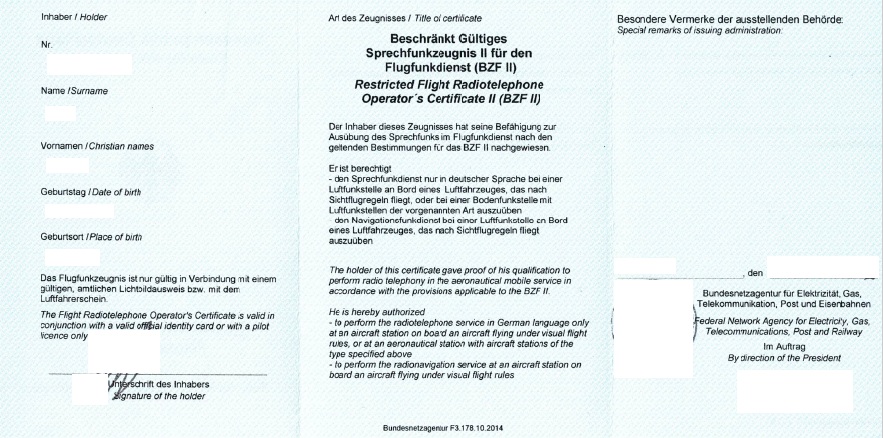 Das Flugfunkzeugnis BZF II ist auf deutsch und kannst Du nur in Deutschland verwenden. Es muss auch nicht erneuert werden.